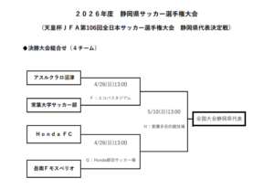 4月26日(日) に2026年度静岡県サッカー選手権大会 (天皇杯JFA第106回全日本サッカー選手権大会静岡県代表決定戦) 準決勝でHonda FCと対戦しますのでお知らせいたします。